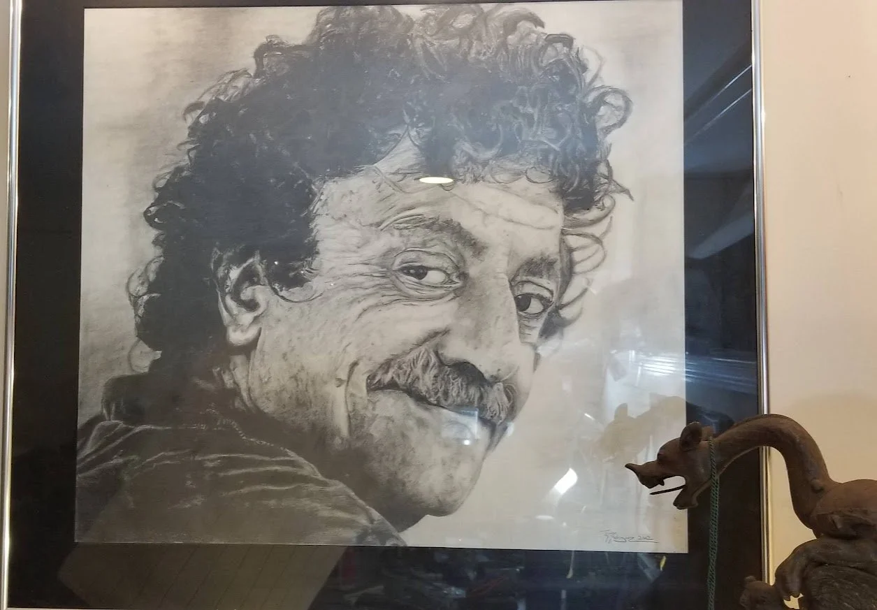 I don’t bear any ill-will toward Mr. Vonnegut for it. I admire him too much. In art school, I spent twenty hours making a 20″x20″ pencil rendering of him. I read everything he ever wrote. Several times. And I seemed to walk in the same circles he did, only years later. I tried to get him to sign my drawing but there was confusion and by the time things got sorted, he left this granfalloon we call earth.